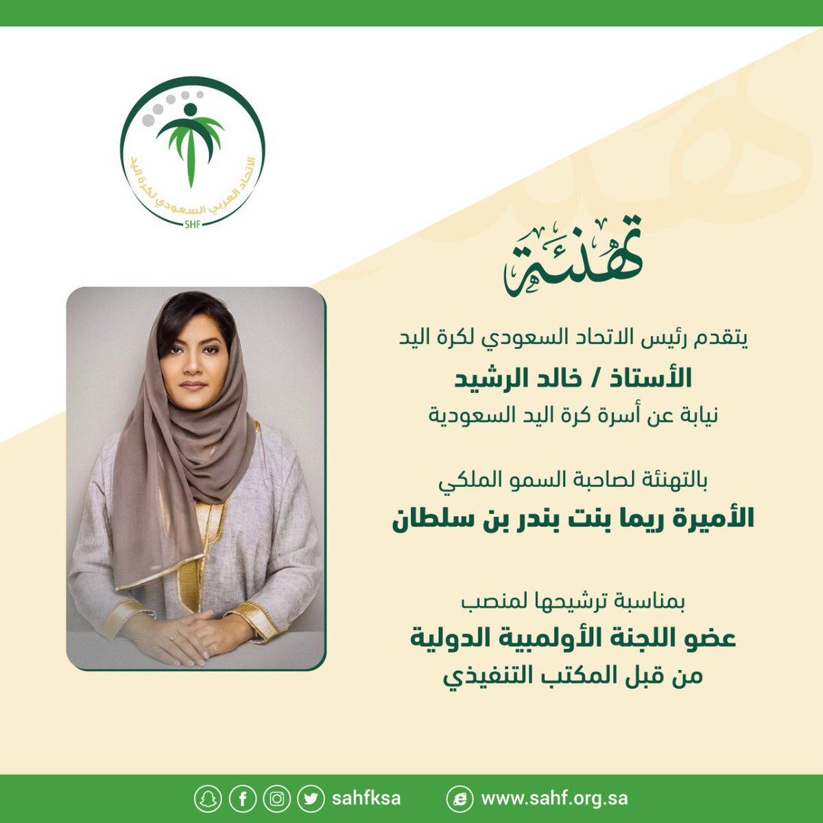 الاتحاد السعودي لكرة اليد على تويتر يتقدم رئيس الاتحاد السعودي لكرة اليد الاستاذ خالد الرشيد نيابة عن اسرة كرة اليد السعودية بالتهنئة لصاحبة السمو الملكي الأميرة ريما بنت بندر بن سلطان بمناسبة