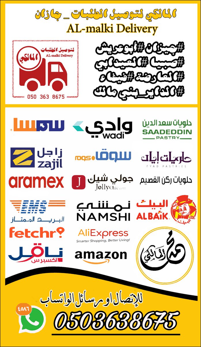 المالكي للتوصيل على تويتر الخدمات التي نقدمها لعملائنا قسم الشحن سمسا ارمكس زاجل فتشر البريد الممتاز سوق كوم قسم المأكولات البيك حلويات سعد الدين حلويات ركن القصيم حلويات اياد حلويات سنابل السلام للإتصال أو واتساب 050 363 8675 جيزان