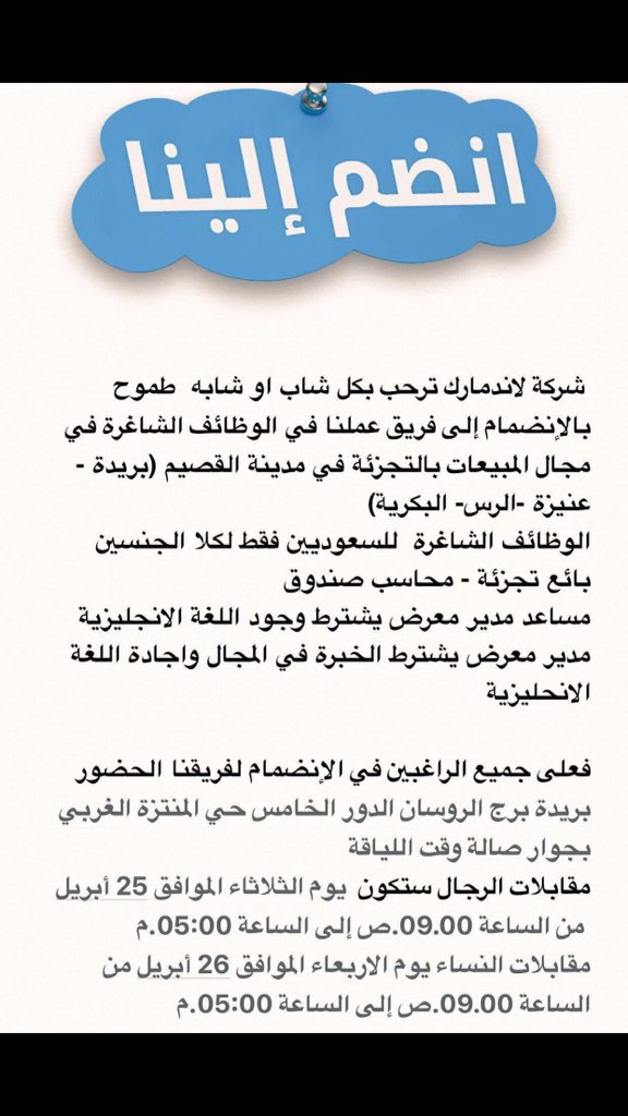 مهند وظائف القصيم Twitterissa تعلن شركة لاند مارك العربية بالتعاون مع مركز طاقات عن ملتقى توظيف للنساء بائعة محاسبة صندوق مساعد مدراء معارض مدراء معارض أماكن