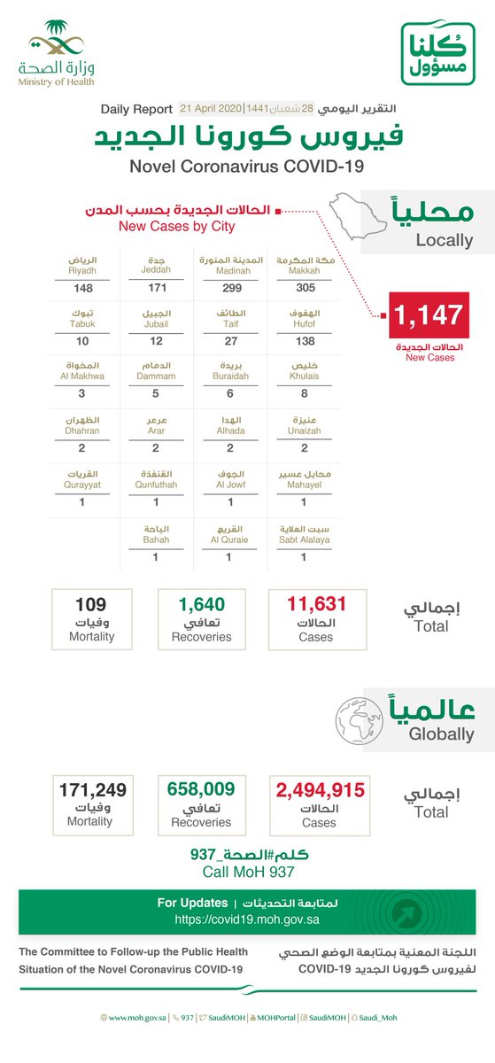 و ز ا ر ة ا لـ صـ حـ ة السعودية On Twitter الصحة تعلن عن تسجيل 576 حالة إصابة جديدة بفيروس كورونا الجديد كوفيد19 وتسجيل 31 حالات وفيات رحمهم الله وتسجيل