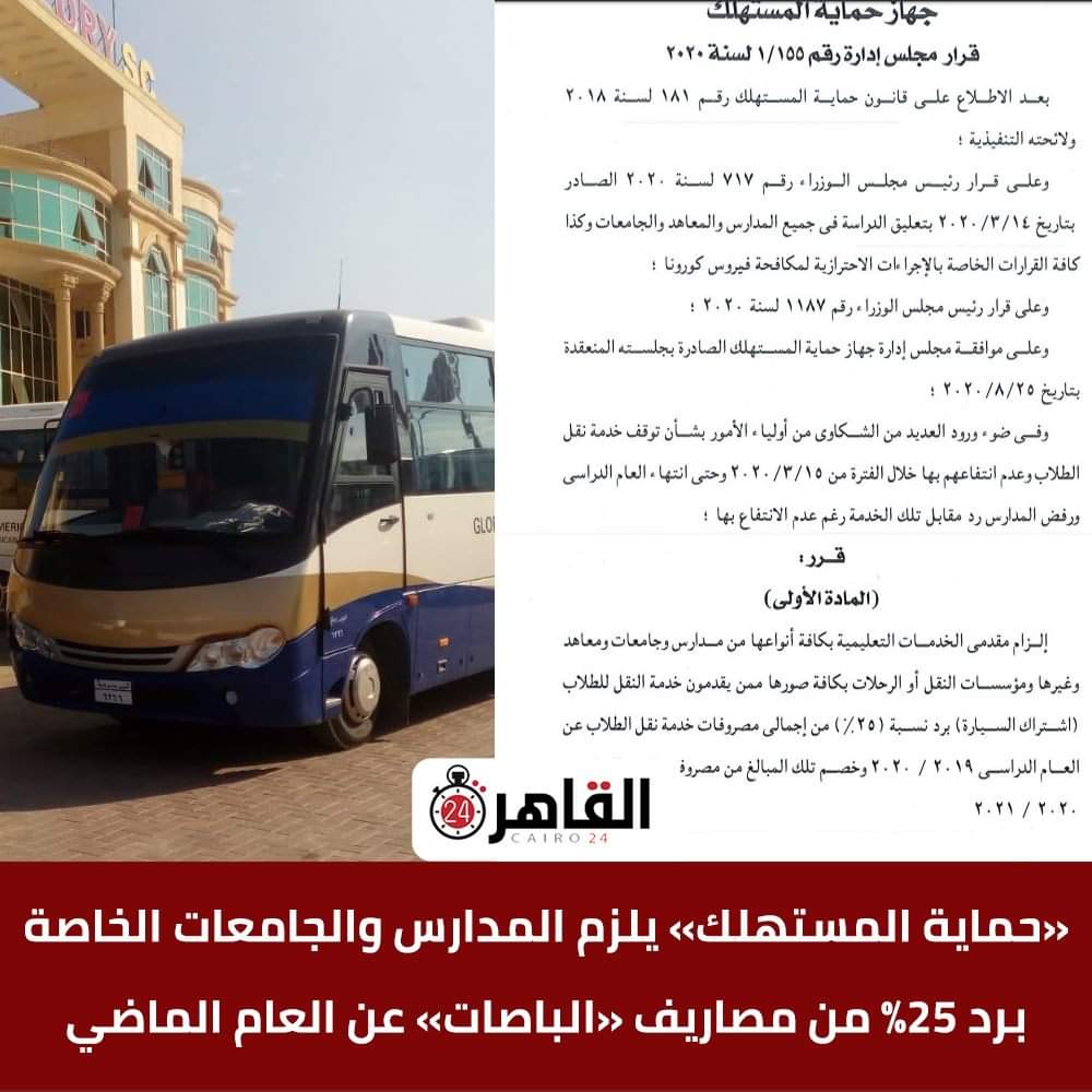 القاهرة 24 عاجل حماية المستهلك يلزم المدارس والجامعات الخاصة برد 25 من مصاريف الباصات عن العام الماضي